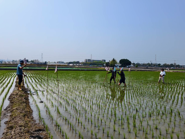 這塊田在過年前已經施加玄武岩粉,這次在插完秧後,需要重新標記實驗小區的位置。